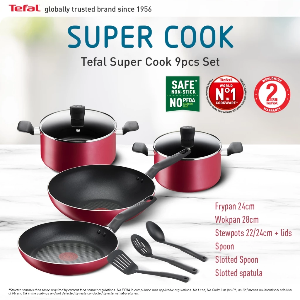 Tefal Supercook 9pcs set (Frypan 24cm, Wokpan 28cm, Stewpot 22cm & 24cm, 3 Spatulas)